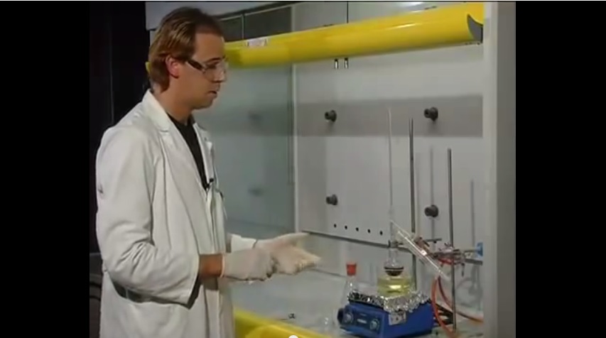 In questo video si osserva come partendo da un alcol e facendolo reagire con un acido forte ( ac. solforico) è possibile ottenere l'eliminazione del gruppo OH dell'alcol sotto forma di acqua con la conseguente formazione del doppio legame tipico degli alcheni.